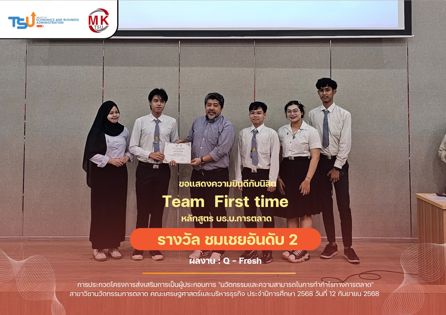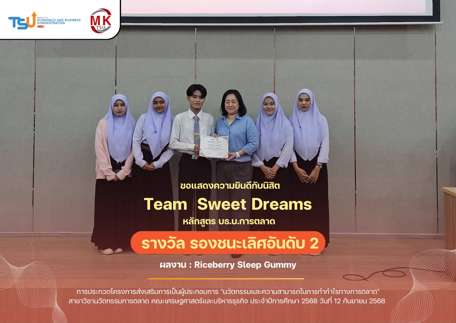 เมื่อวันที่ 12 กันยายน 2568 ที่ผ่านมา เพื่อส่งเสริมให้นิสิตในหลักสูตรพัฒนาทักษะความเป็นผู้ประกอบการ เรียนรู้จากการลงมือปฏิบัติจริง พร้อมรับคำแนะนำจากผู้เชี่ยวชาญตลอดระยะเวลาการดำเนินโครงการ