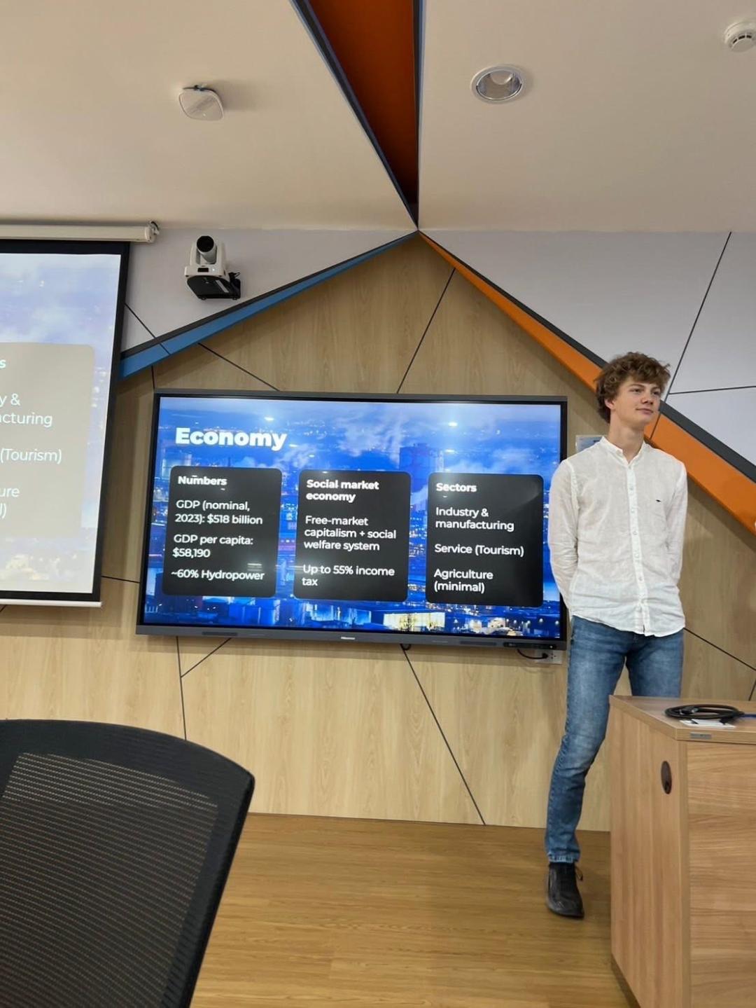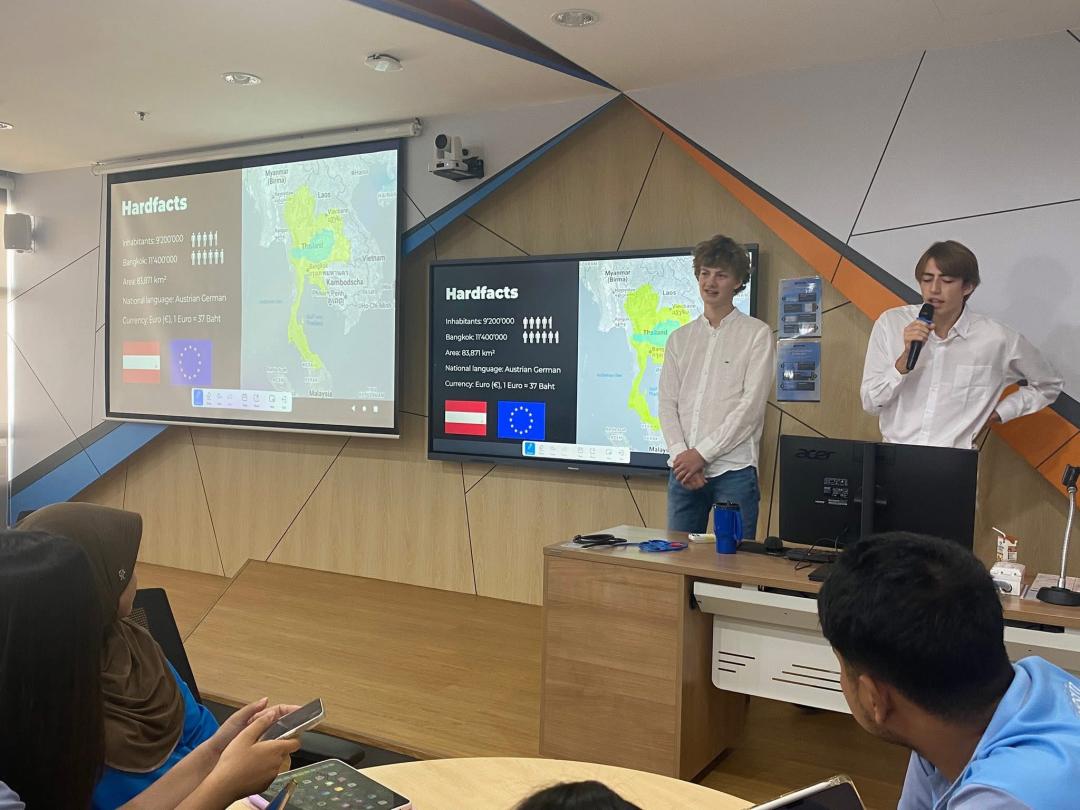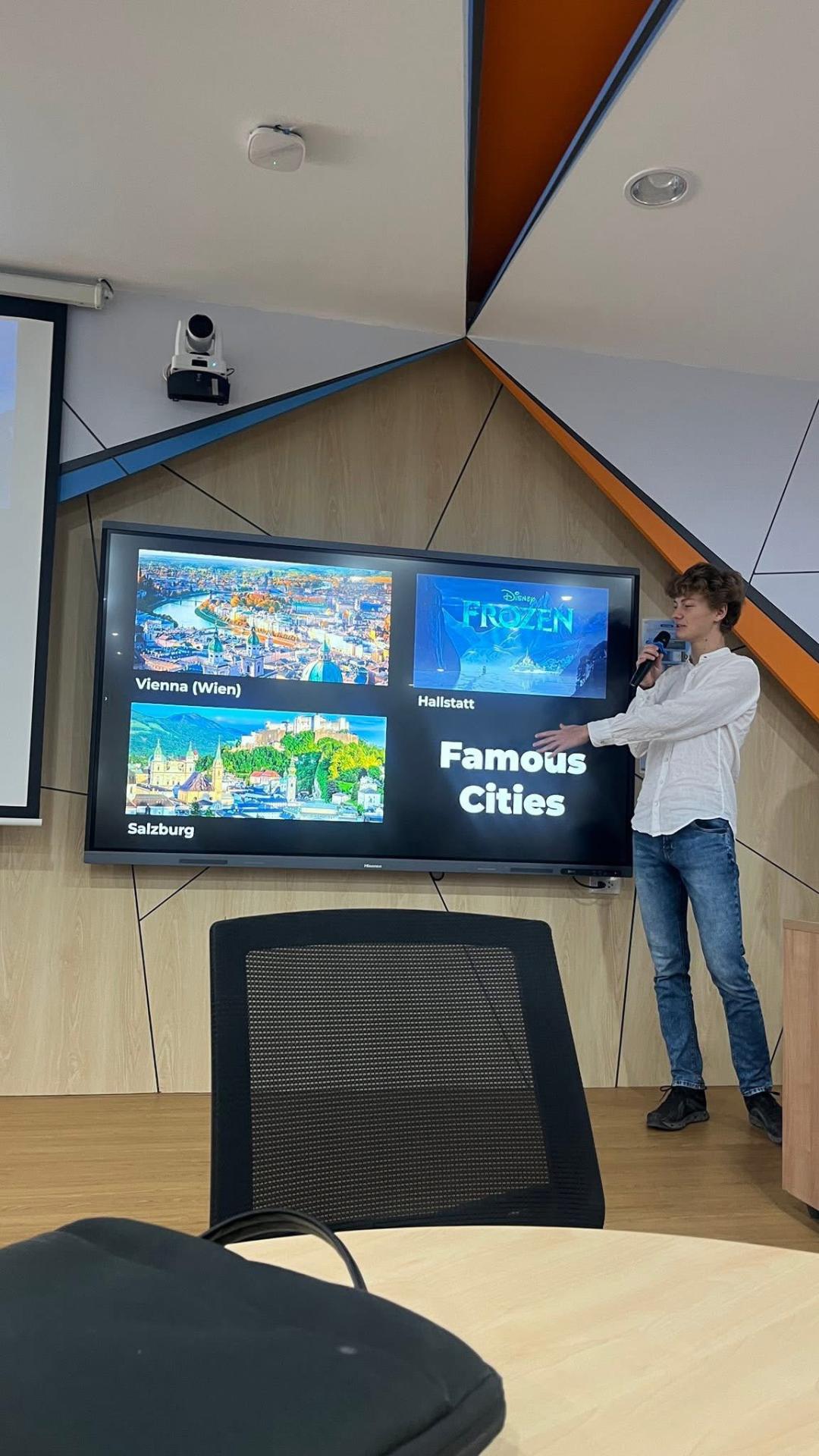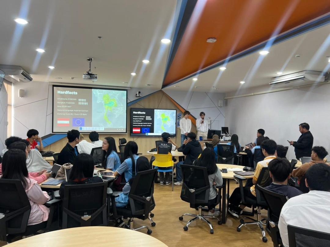 The presentation provided a comprehensive overview of Austria, including its prominent tourist attractions, major sports, and notable aspects of Austrian cuisine, beverages, and cultural traditions. Following the presentation, students were given the opportunity to pose questions regarding Austria and to practice English and basic German with the guest speakers.