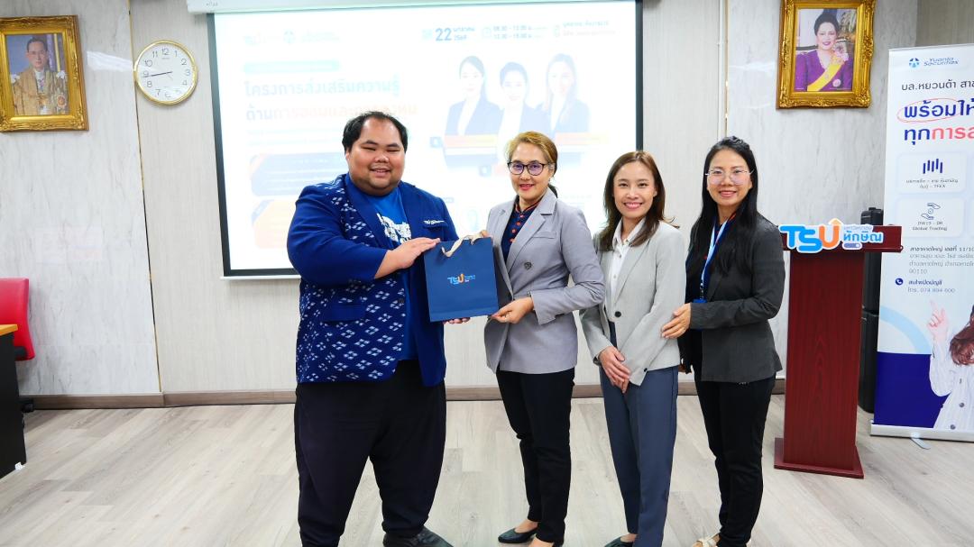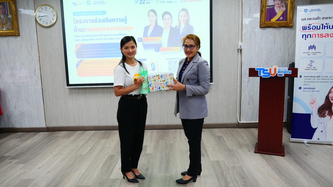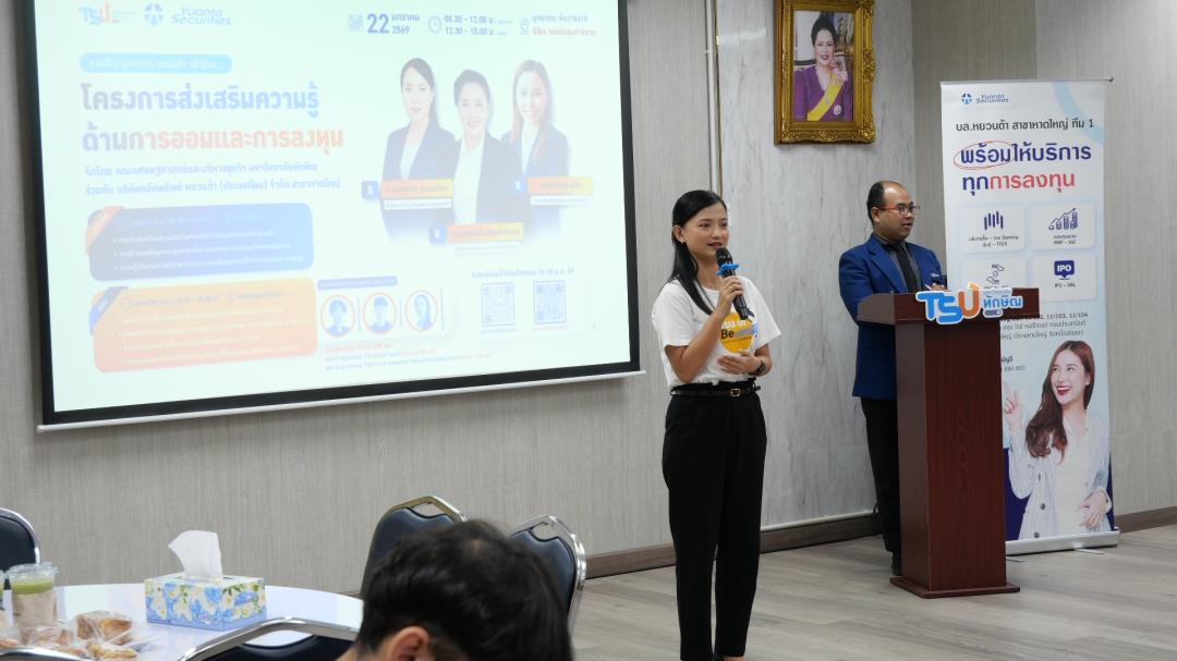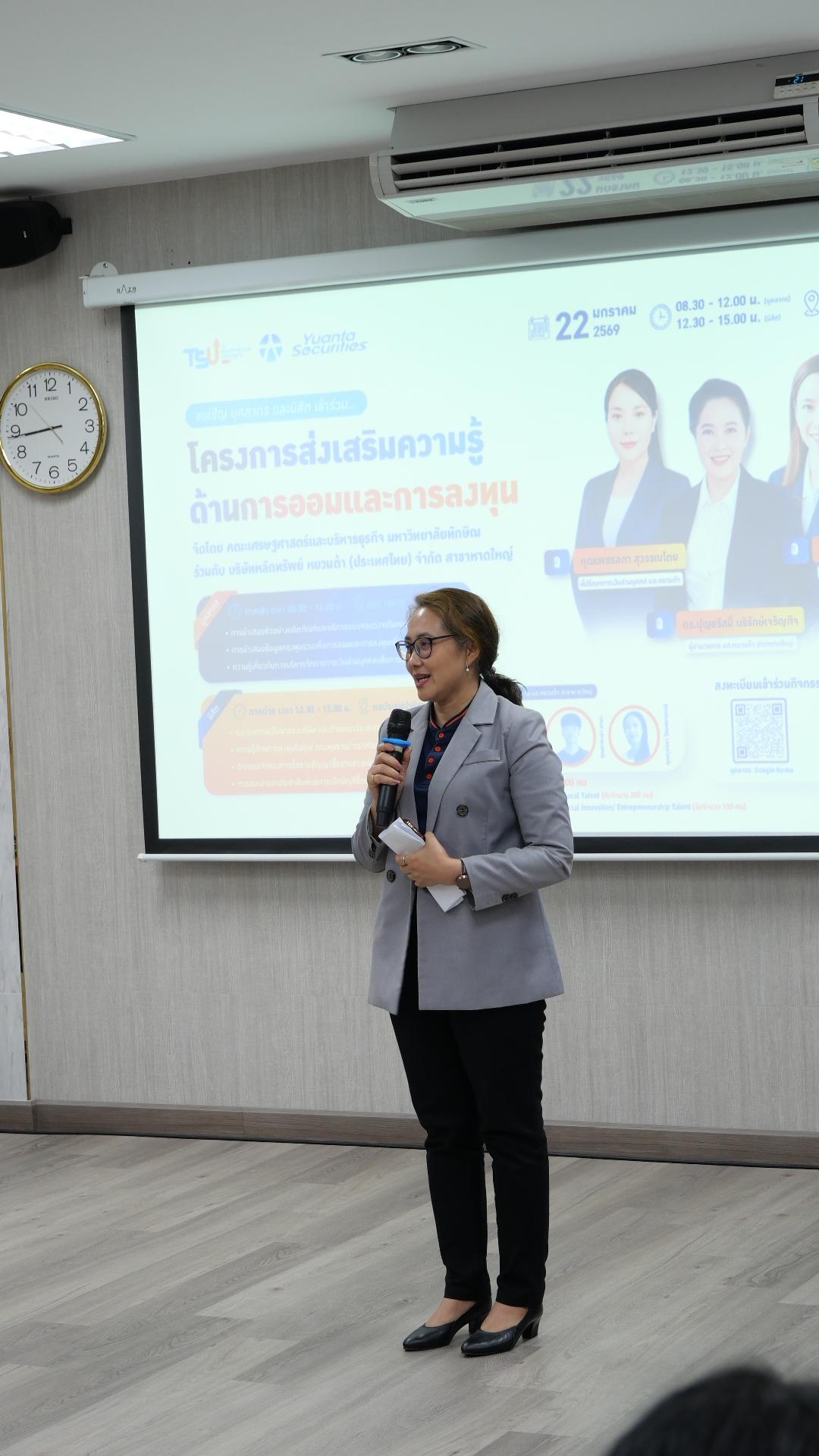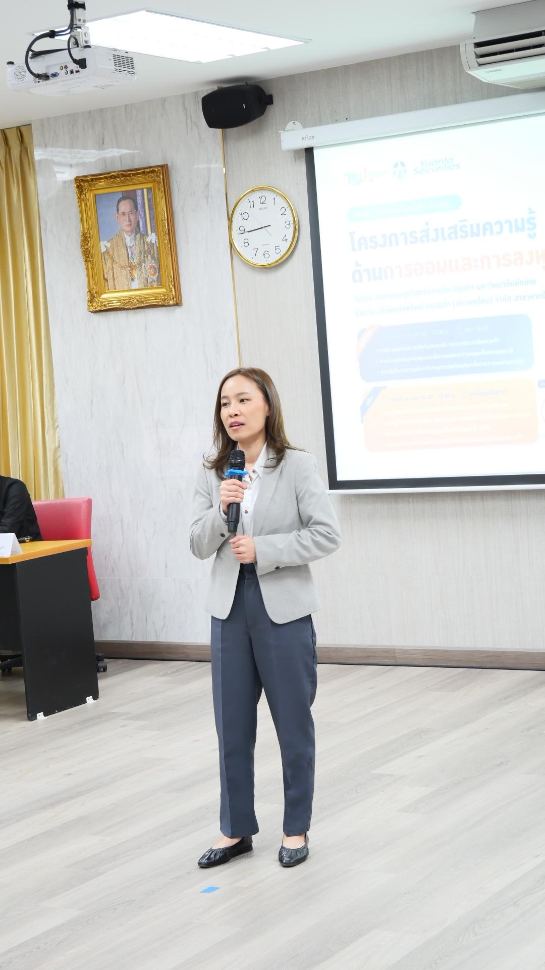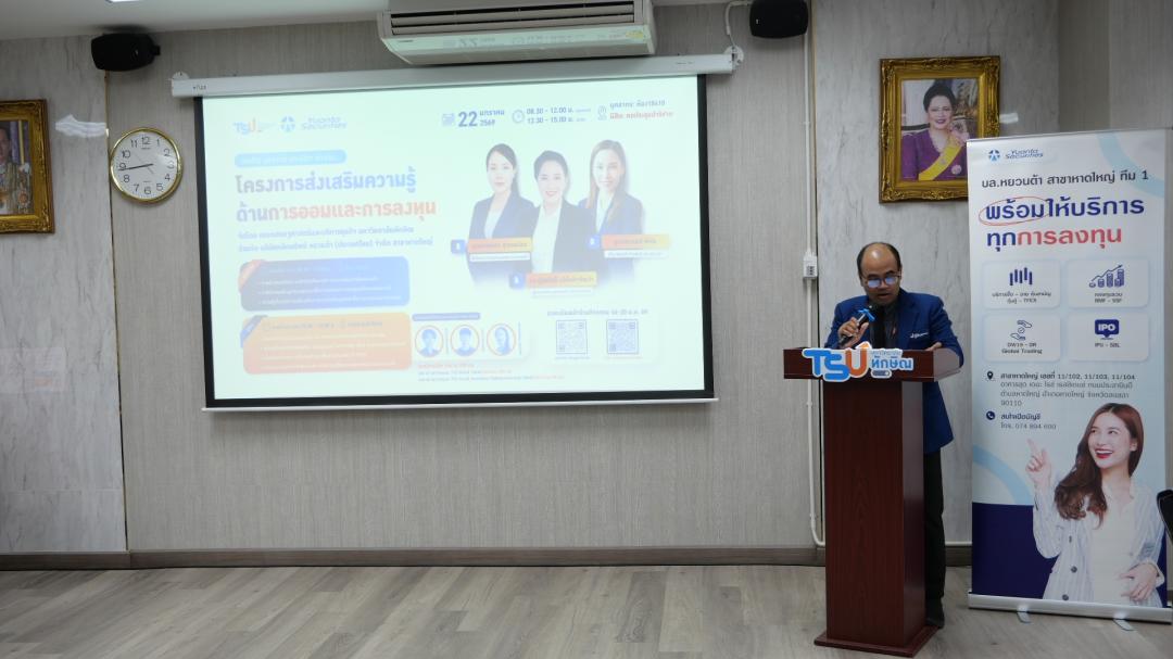 จากนั้น ดร.ปุญชรัสมิ์ บริรักษ์เจริญกิจ ผู้อำนวยการ บริษัทหลักทรัพย์ หยวนต้า (ประเทศไทย) จำกัด สาขาหาดใหญ่ ได้กล่าวถึงวัตถุประสงค์ของการจัดโครงการ พร้อมชี้ให้เห็นถึงบทบาทของภาคเอกชนในการสนับสนุนองค์ความรู้ด้านการเงินแก่สถาบันการศึกษา เพื่อส่งเสริมให้บุคลากรสามารถนำความรู้ไปปรับใช้ได้จริงในชีวิตประจำวัน และวางแผนทางการเงินได้อย่างมีประสิทธิภาพ
