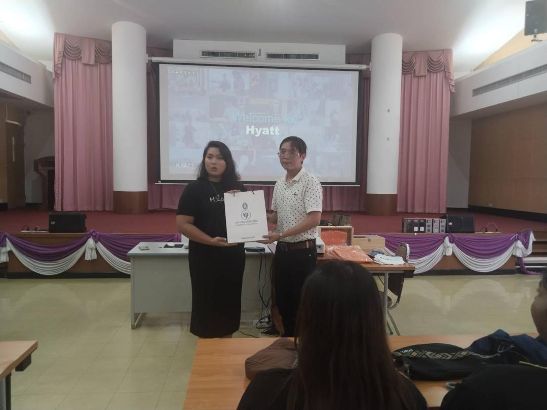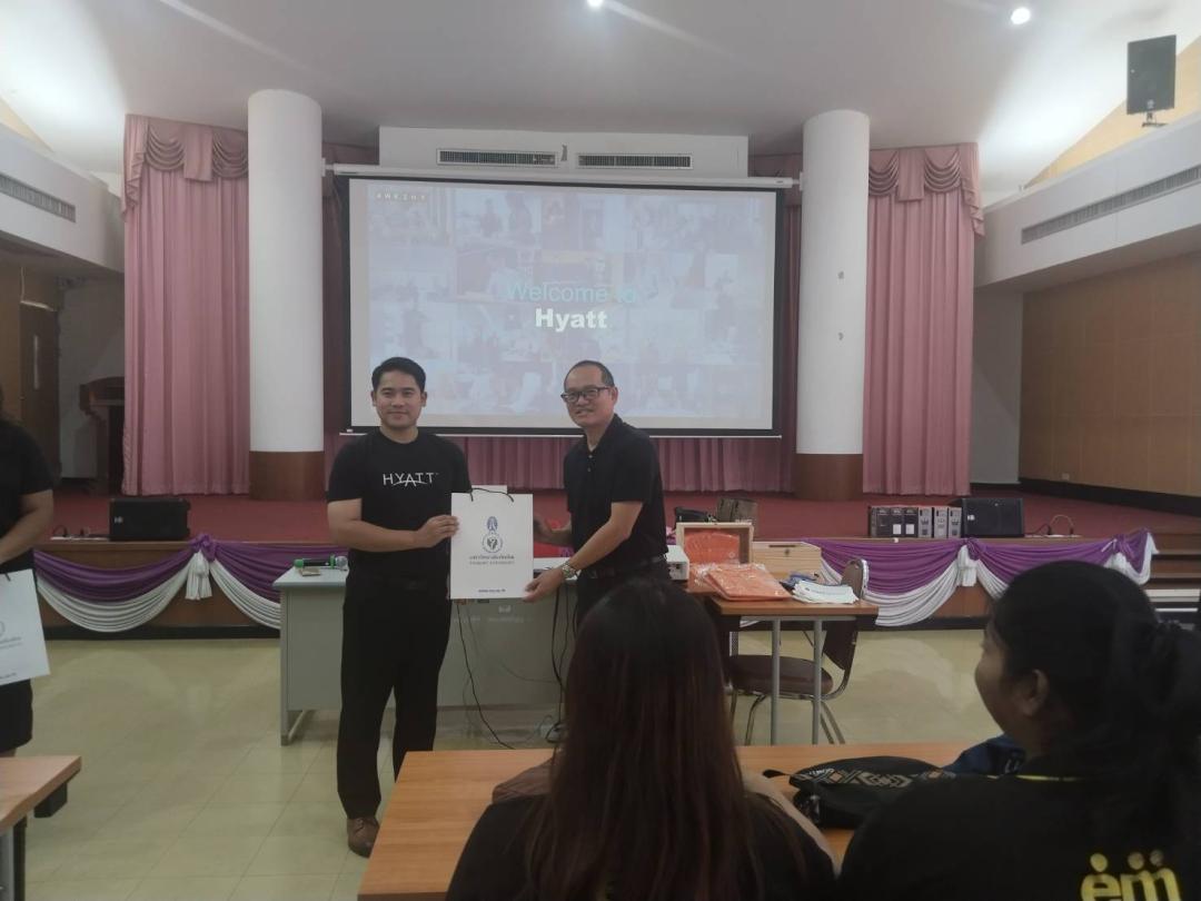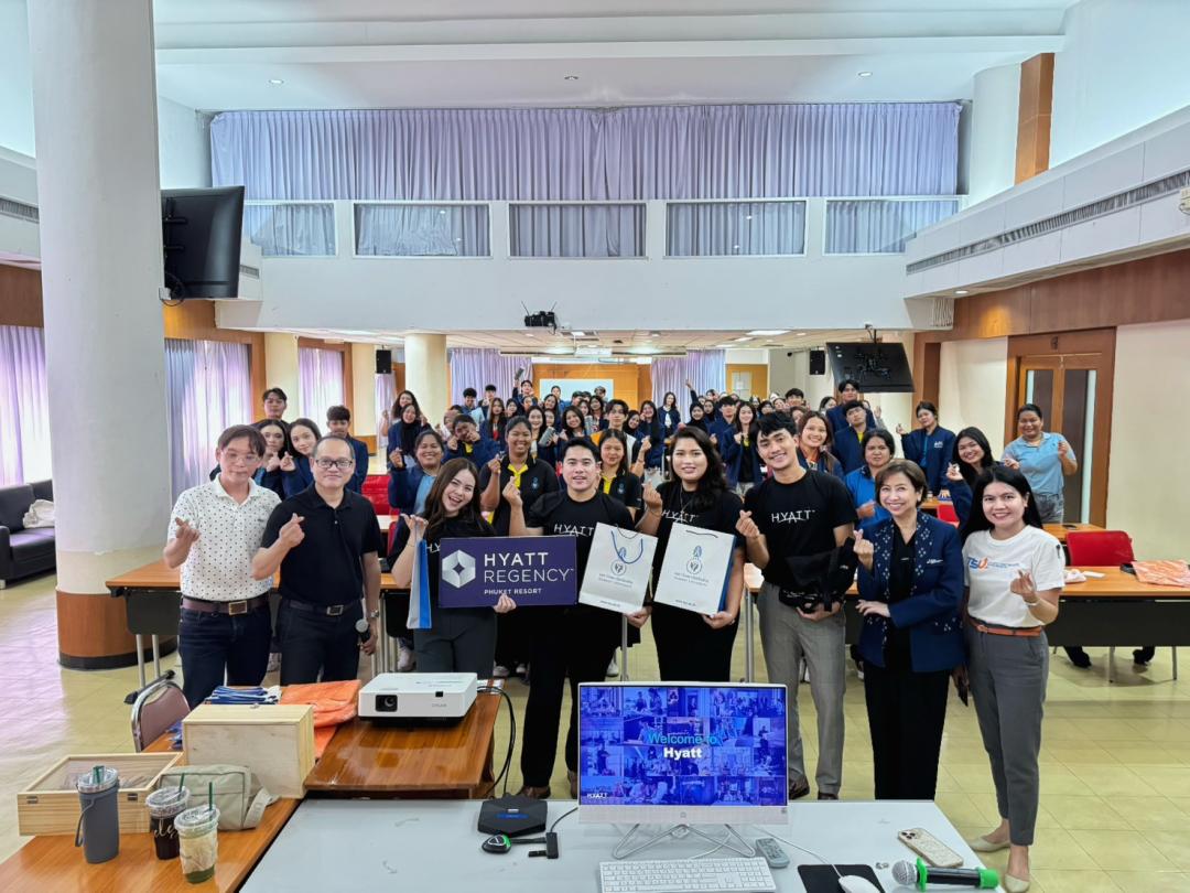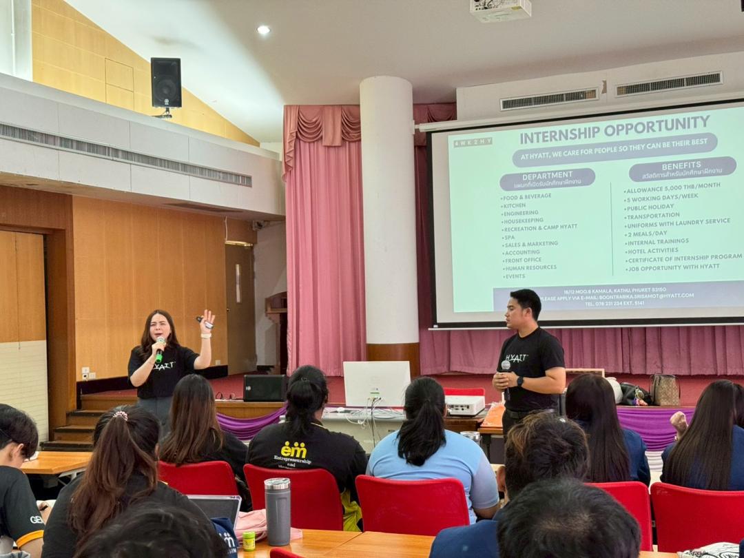 ภายในกิจกรรม นิสิตได้เจาะลึกข้อมูลการฝึกงานในอุตสาหกรรมโรงแรมอย่างรอบด้าน จากทีมทรัพยากรบุคคลของโรงแรม Hyatt Regency Phuket Resort องค์กรโรงแรมระดับสากล ที่มาร่วมถ่ายทอดประสบการณ์จริง ได้แก่
